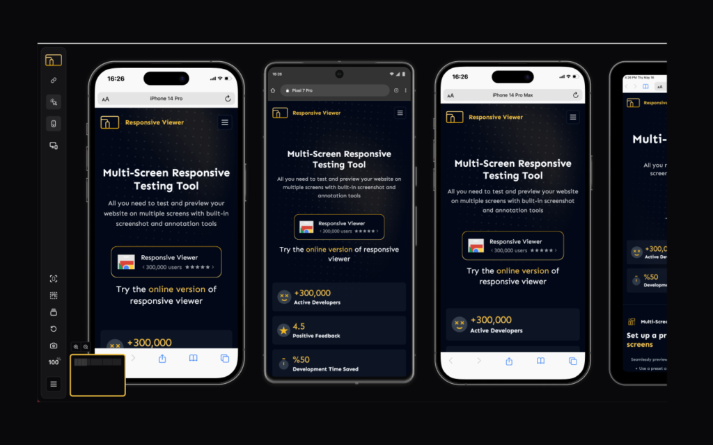 Responsive Viewerは、Webデザインにおけるレスポンシブデザインの確認を効率化するChrome拡張機能です。 デバイスごとに異なる画面サイズでデザインがどのように表示されるのかを、一括で確認することができます。